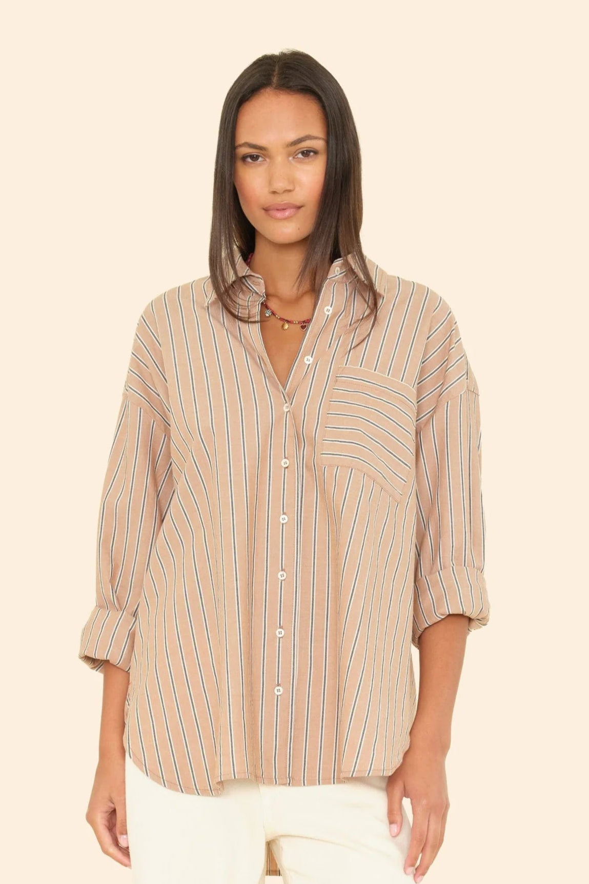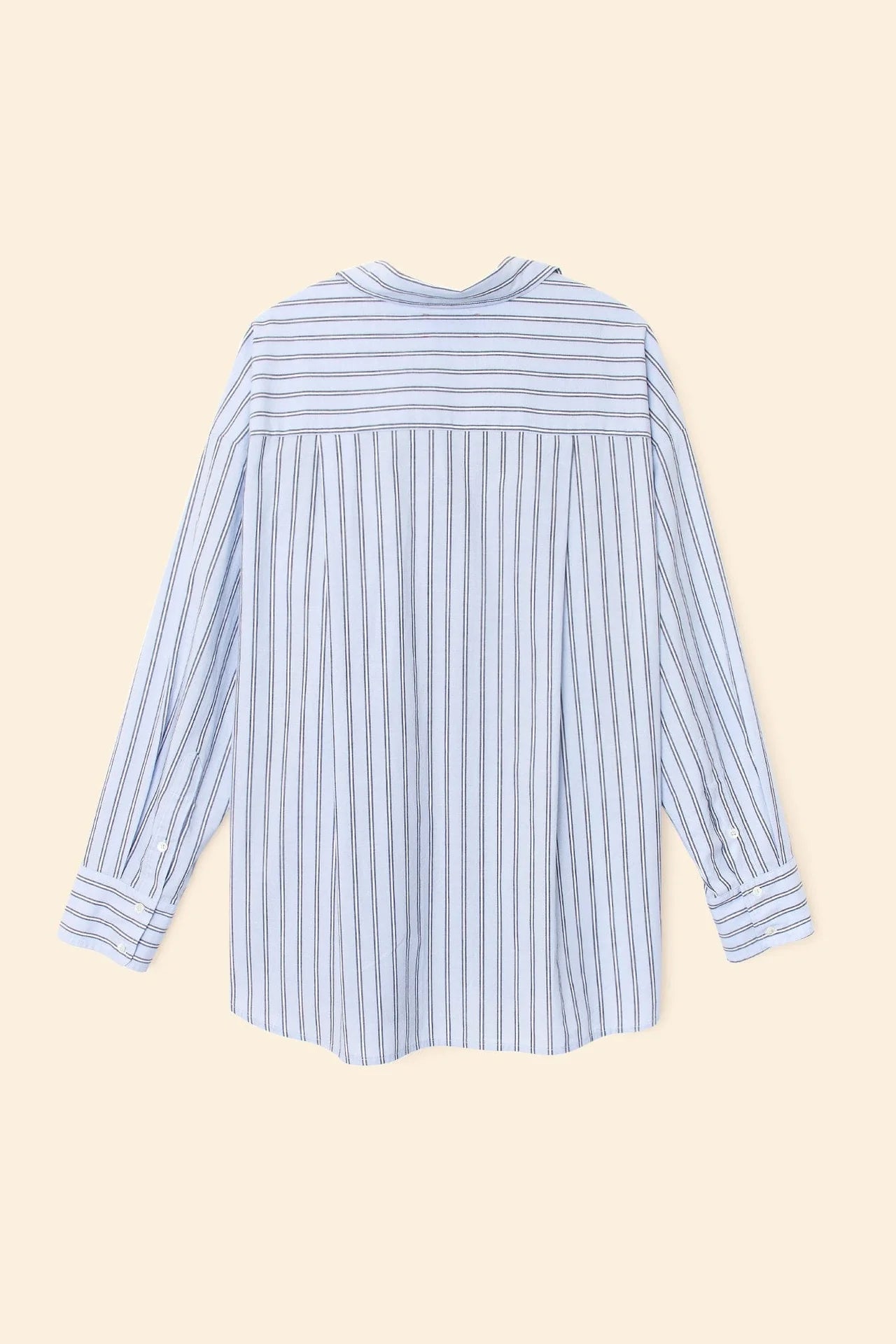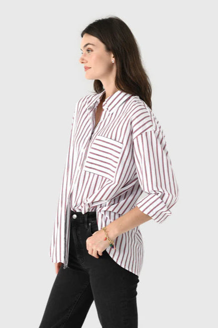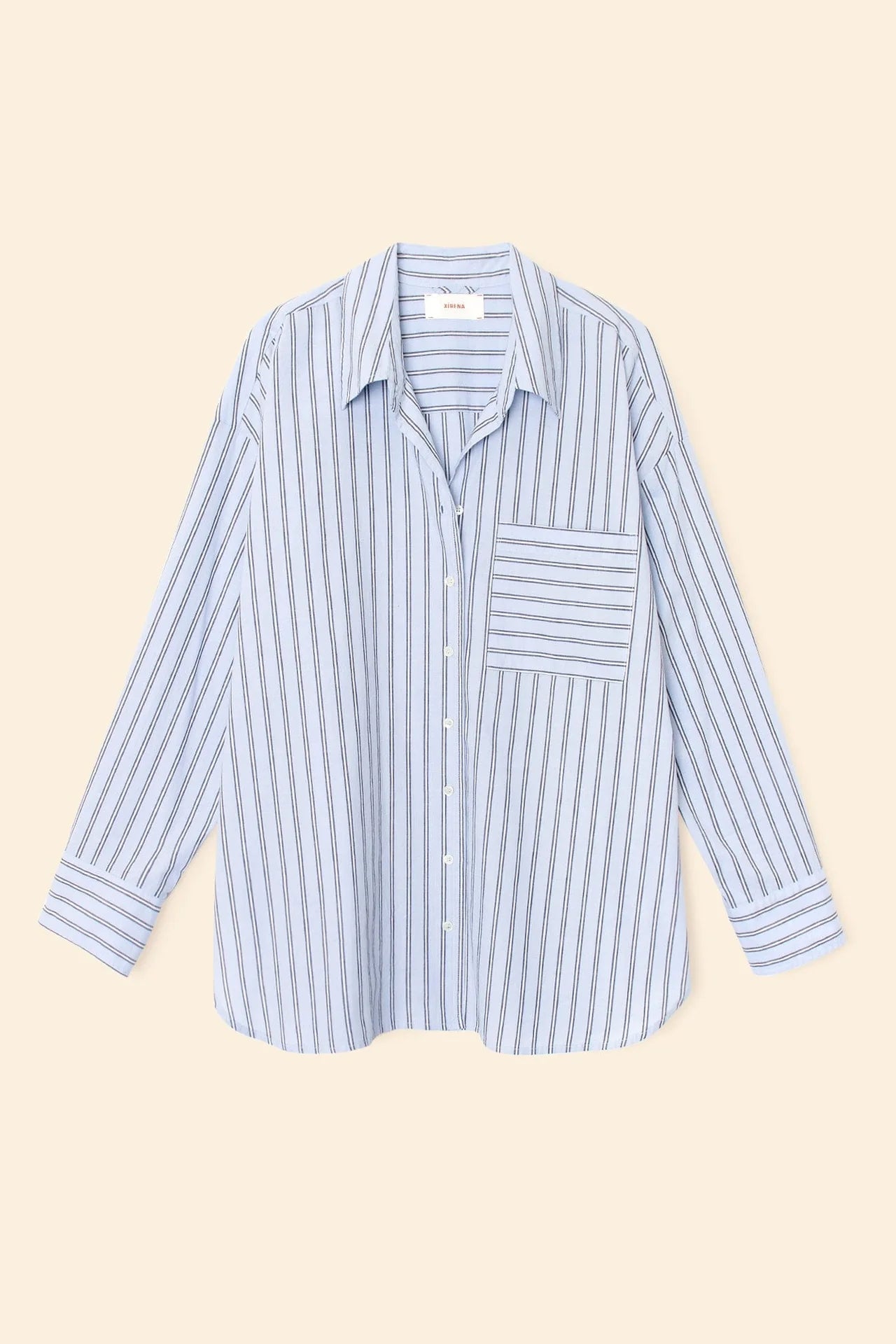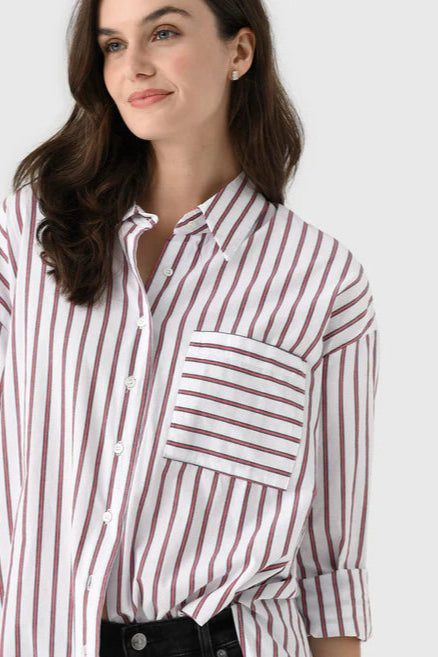 Earn your stripes. Sydney is updated this season in our crisp cotton pencil stripe. Sydney is an oversized button-down shirt with a left chest patch pocket