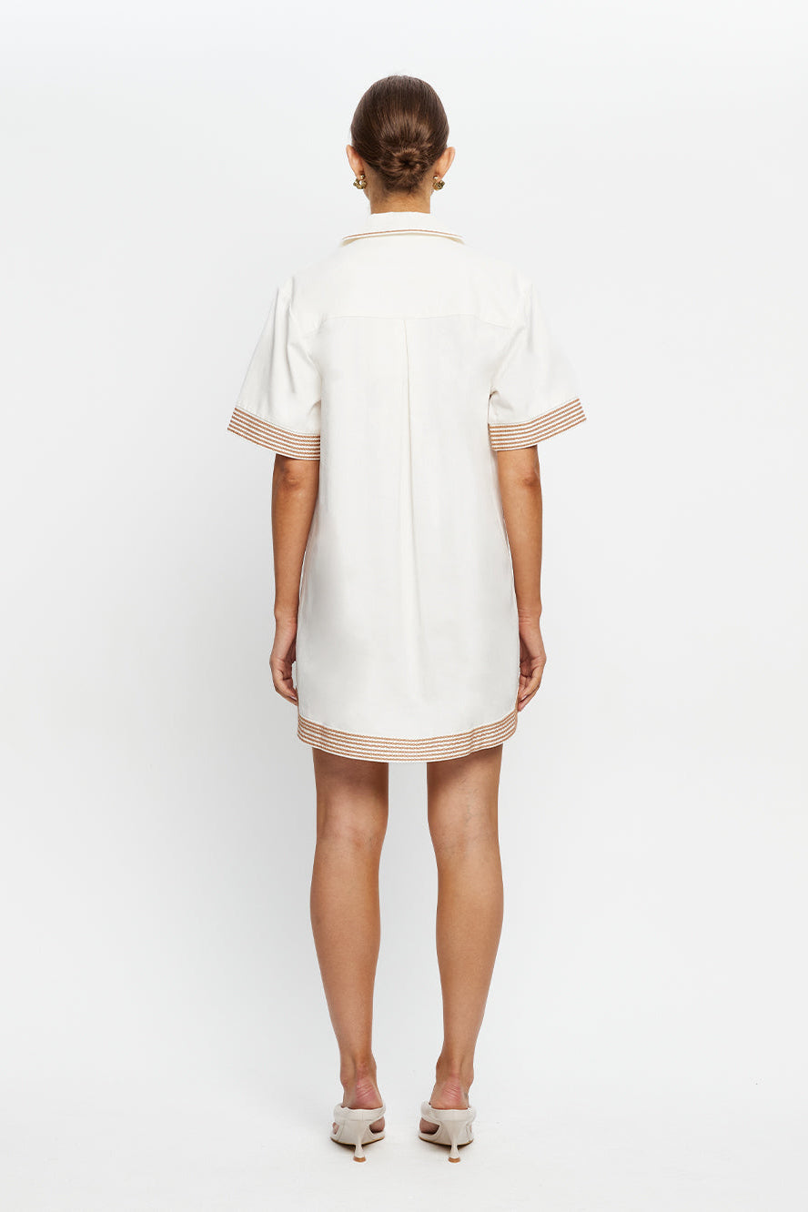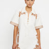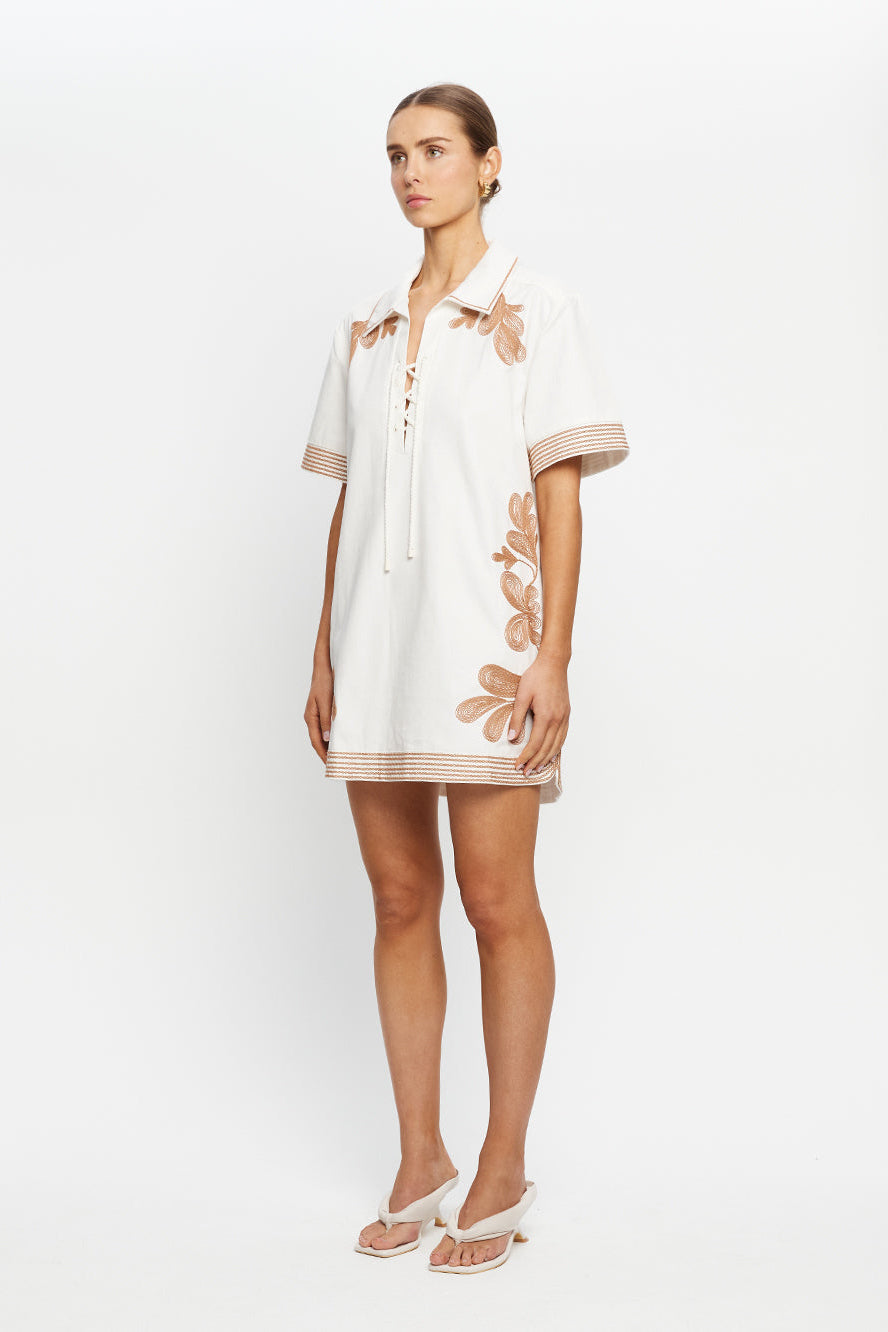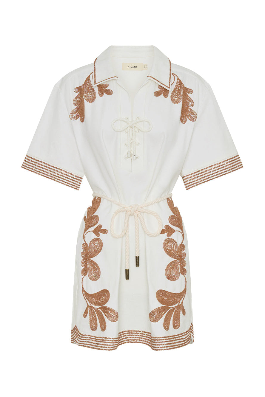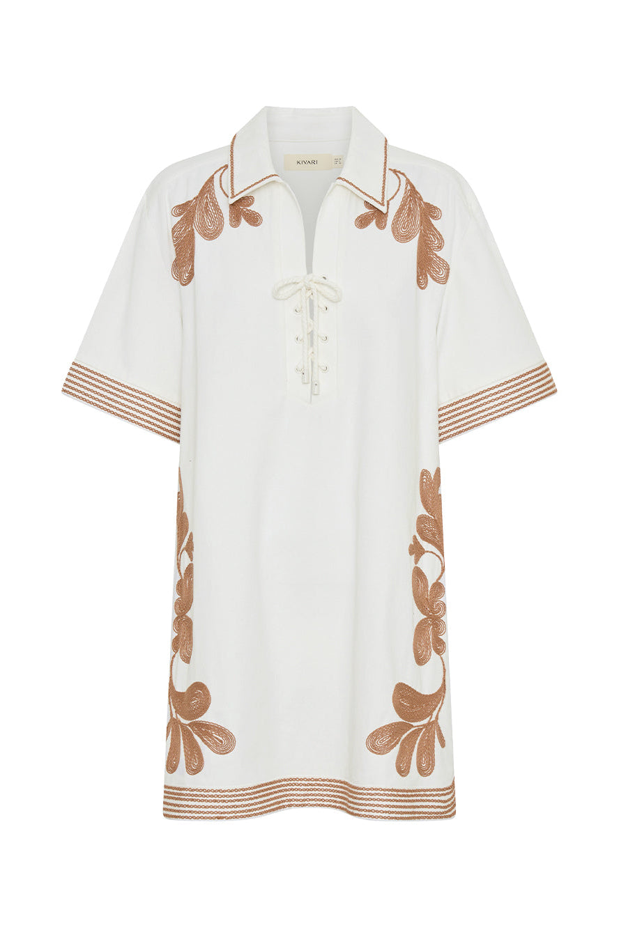 The Moni Mini Dress is a relaxed shirt silhouette featuring a lace-up detail at the bust and intricate brown floral embroidery throughout. Finished with a softly curved hem, it blends feminine detail with laid-back ease — a timeless style designed for sunlit days and effortless wear.