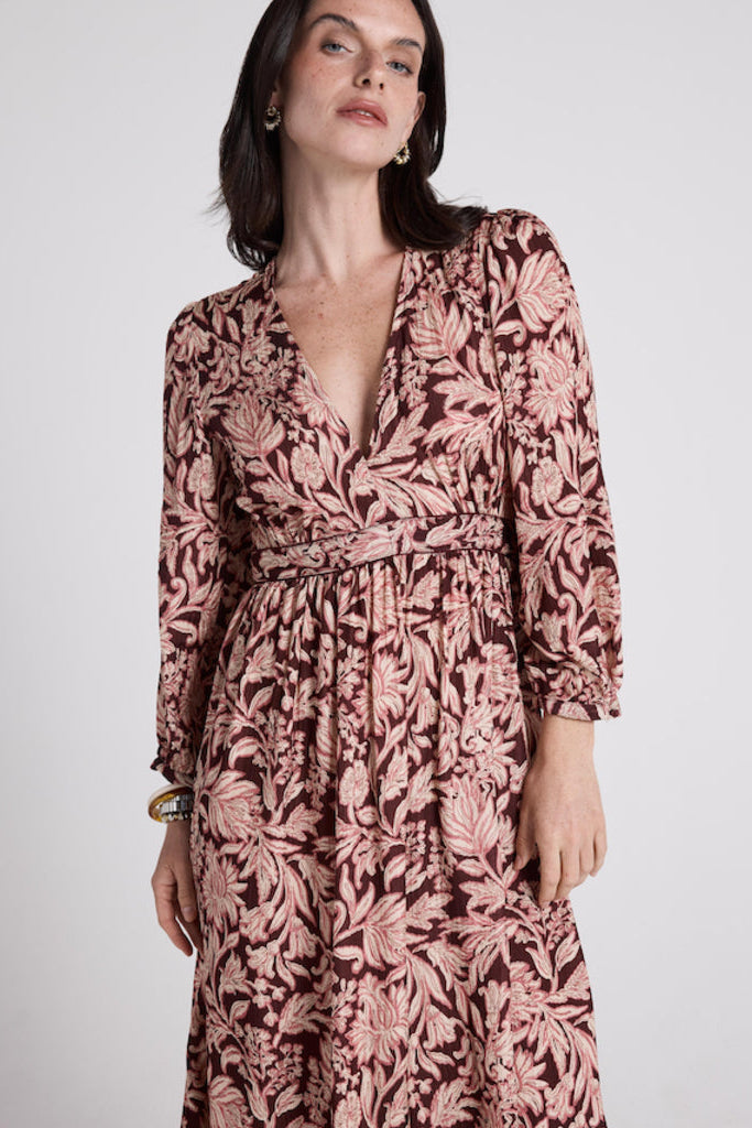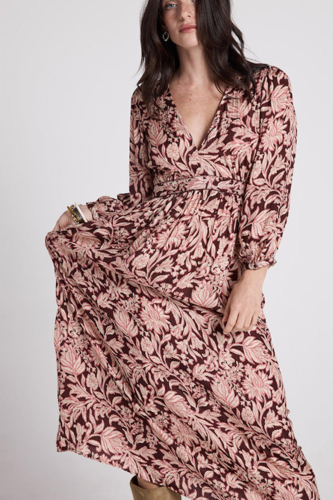 OPRAH is a maxi dress with long, slightly puffed sleeves and a V-neckline. Its fitted waist offers an elegant look, emphasizing the woman's figure while remaining comfortable.