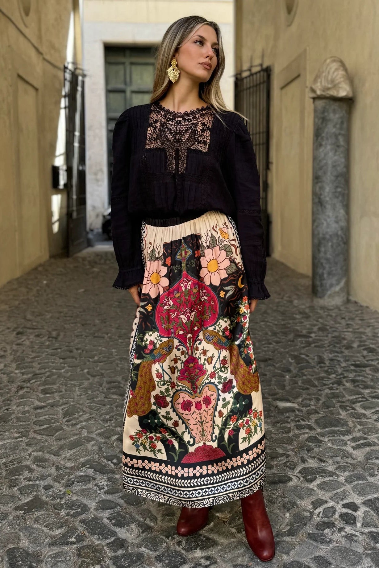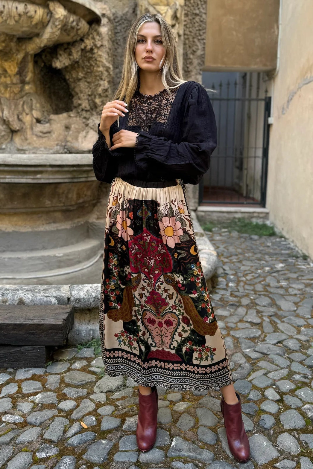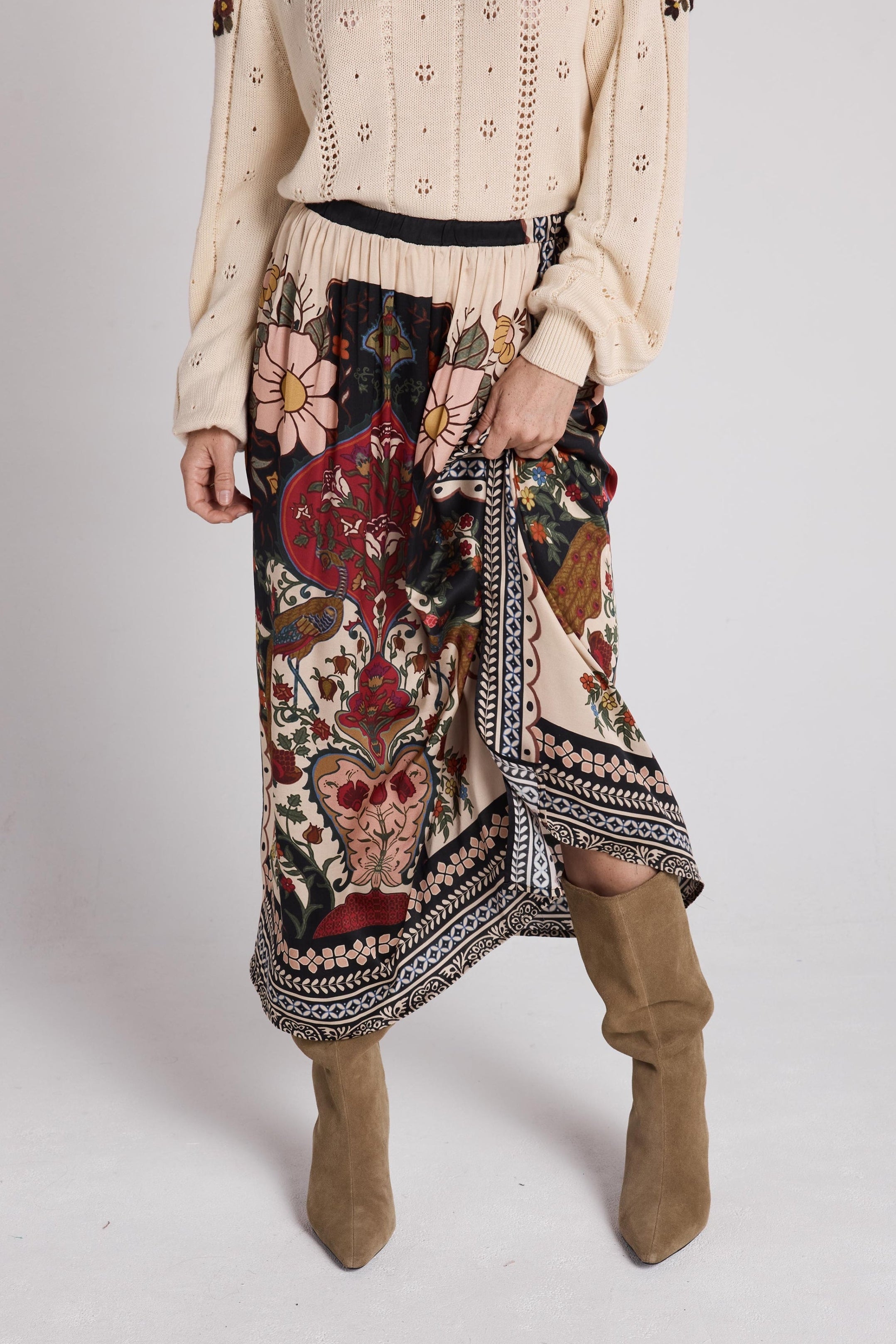 SIXTINE is a flowing midi skirt with a multicoloured peacock print, an elasticated waist and a side slit.