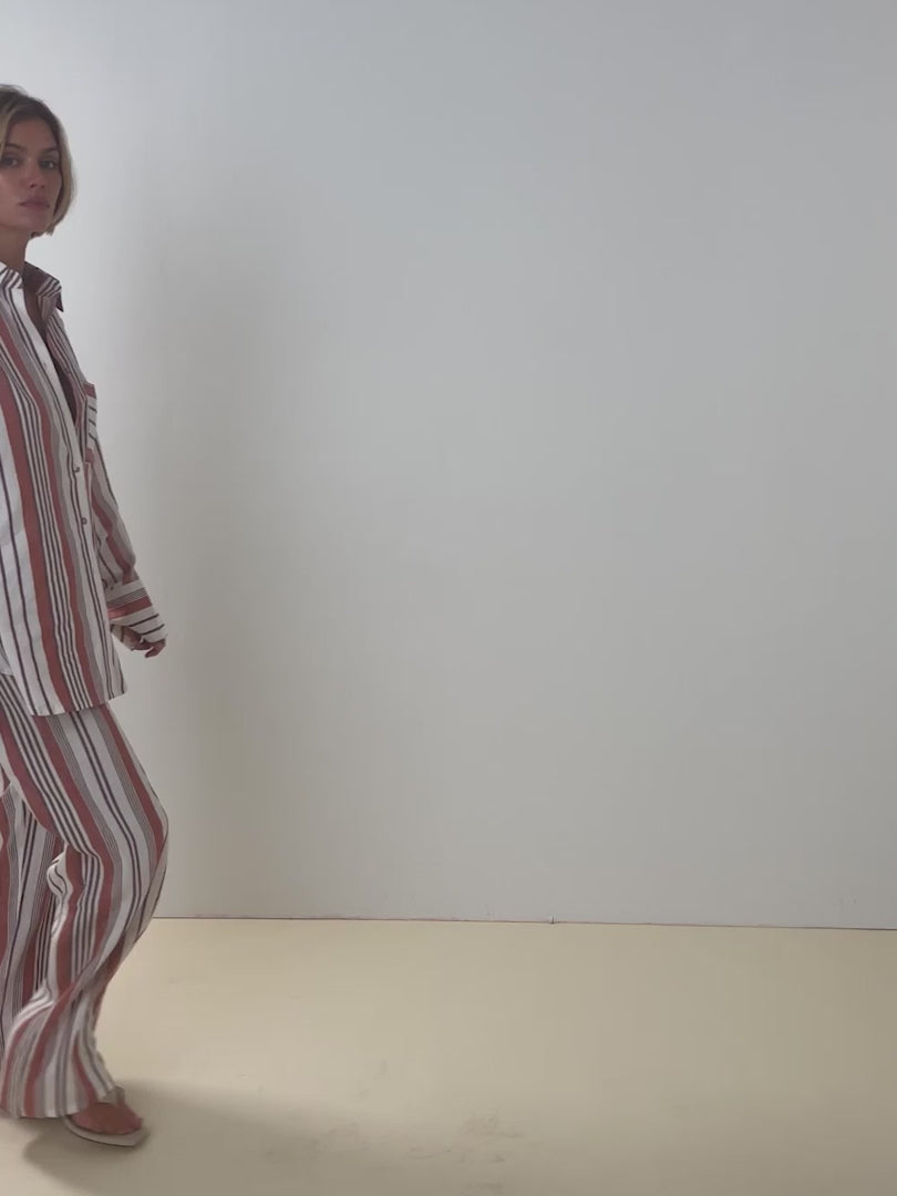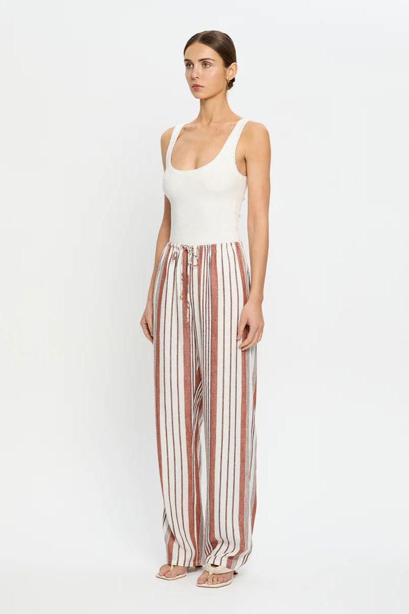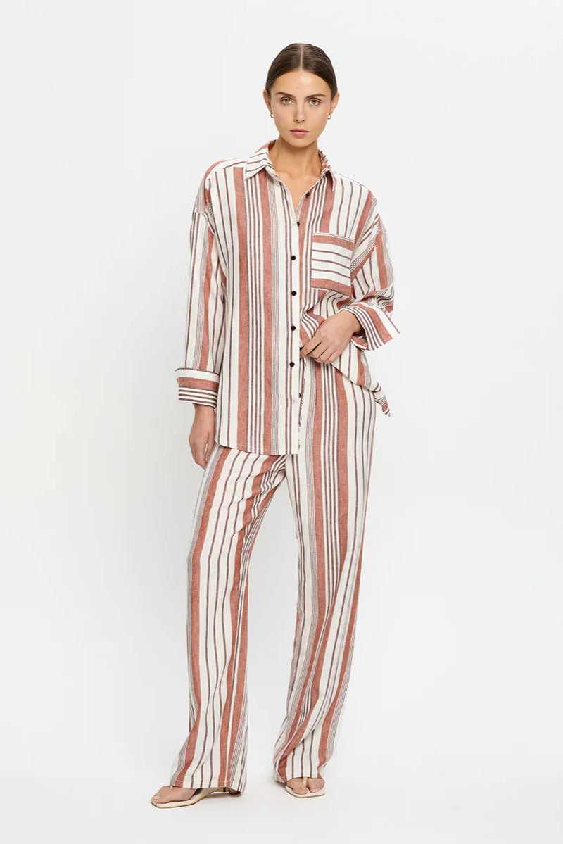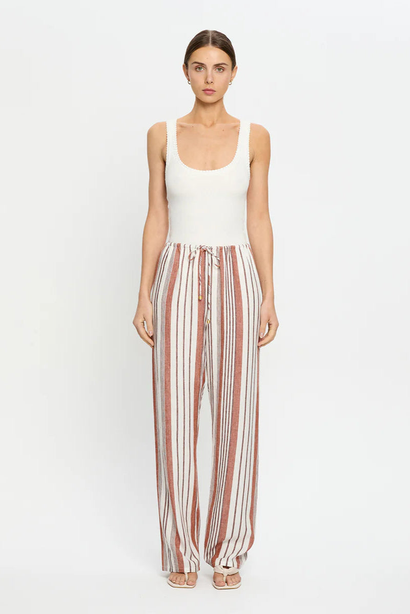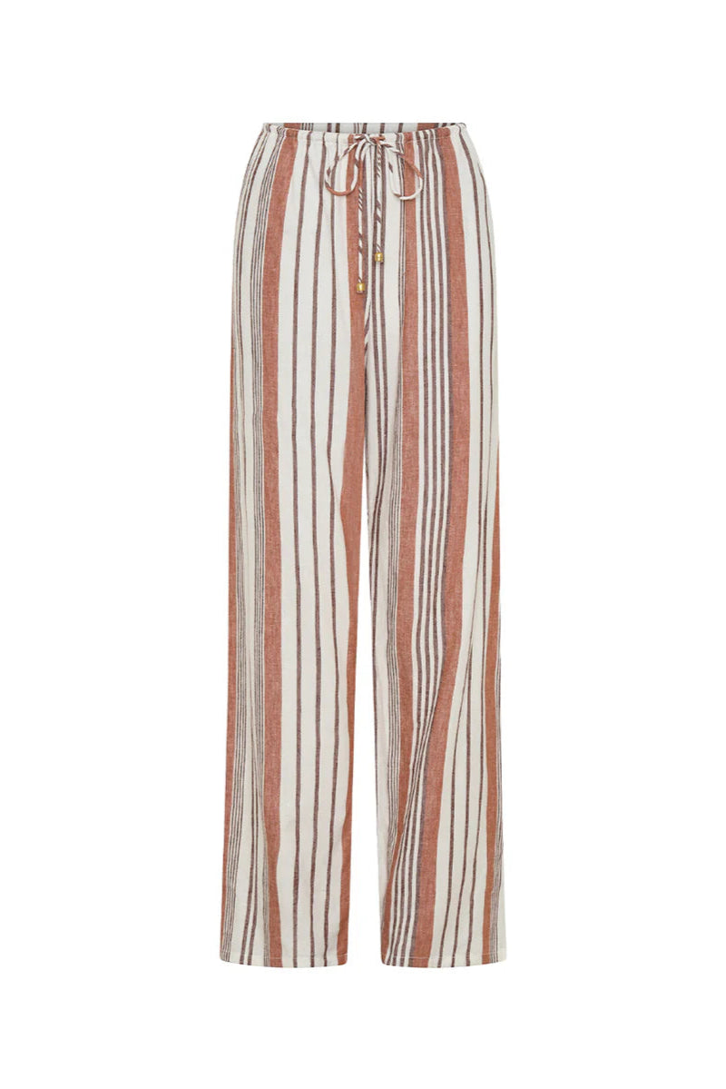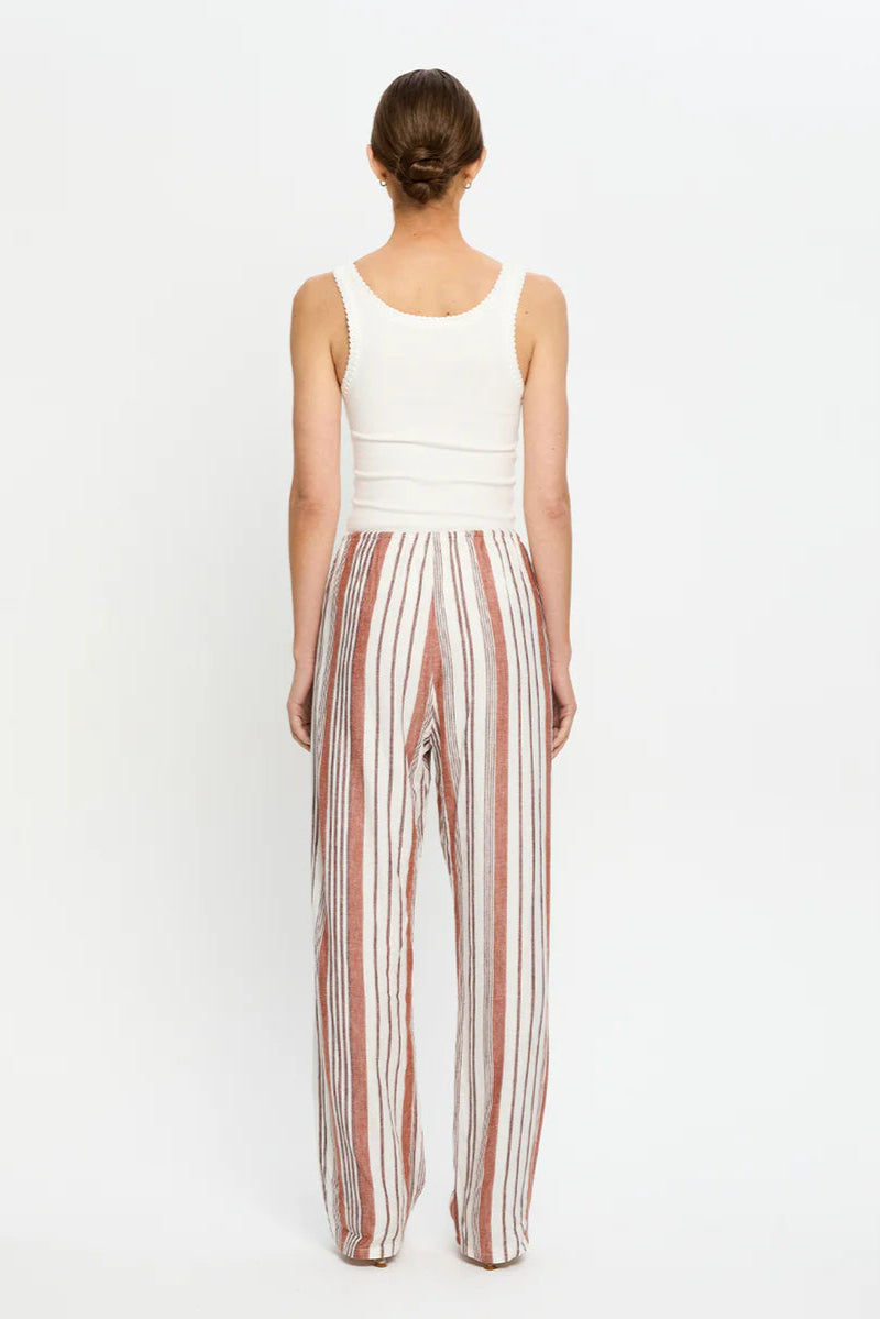 Elms is a two toned brown stripe on a soft ivory base. The Elms Pant is a relaxed straight leg pant featuring an elasticated waistband complete with a drawcord.