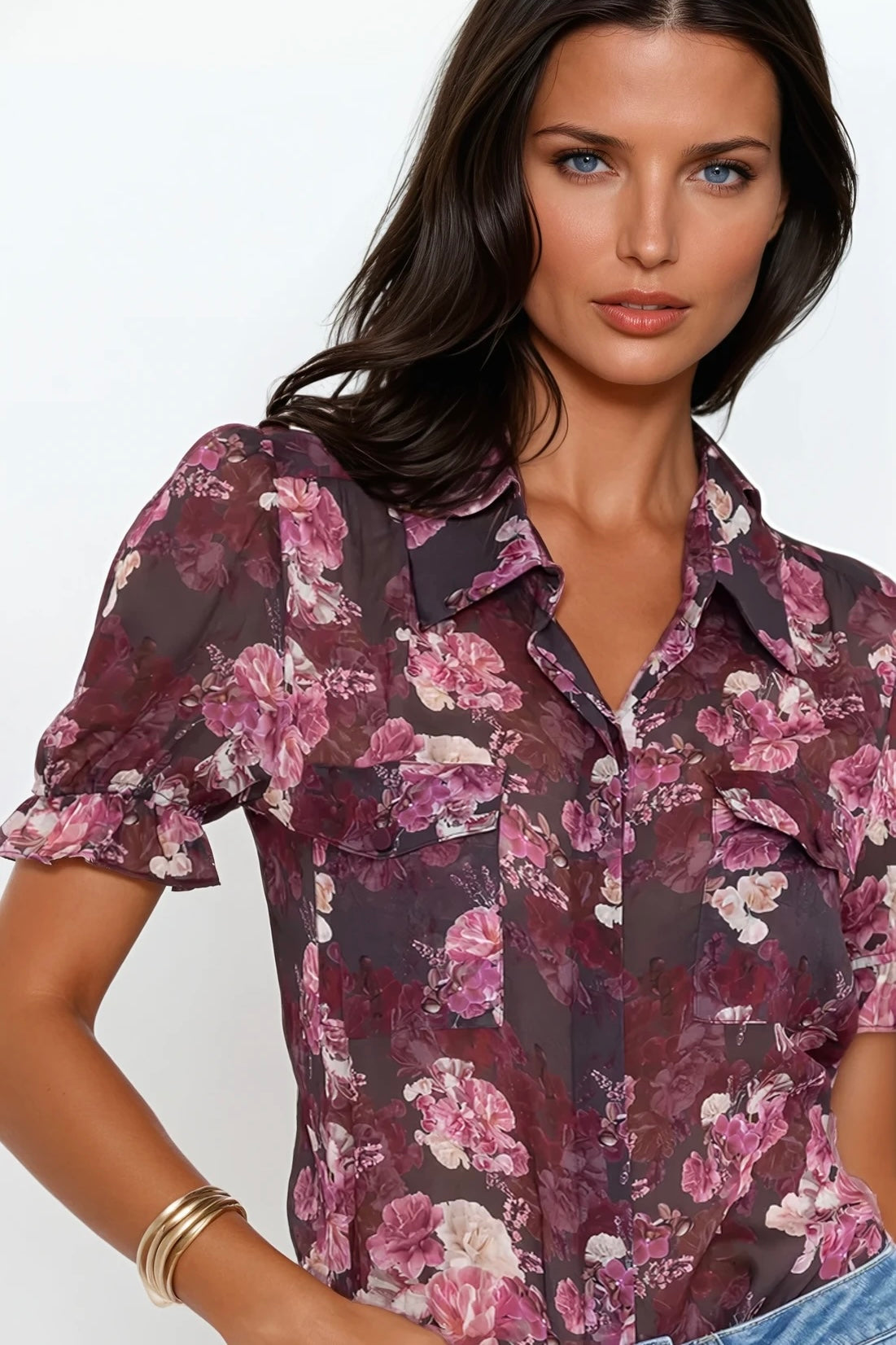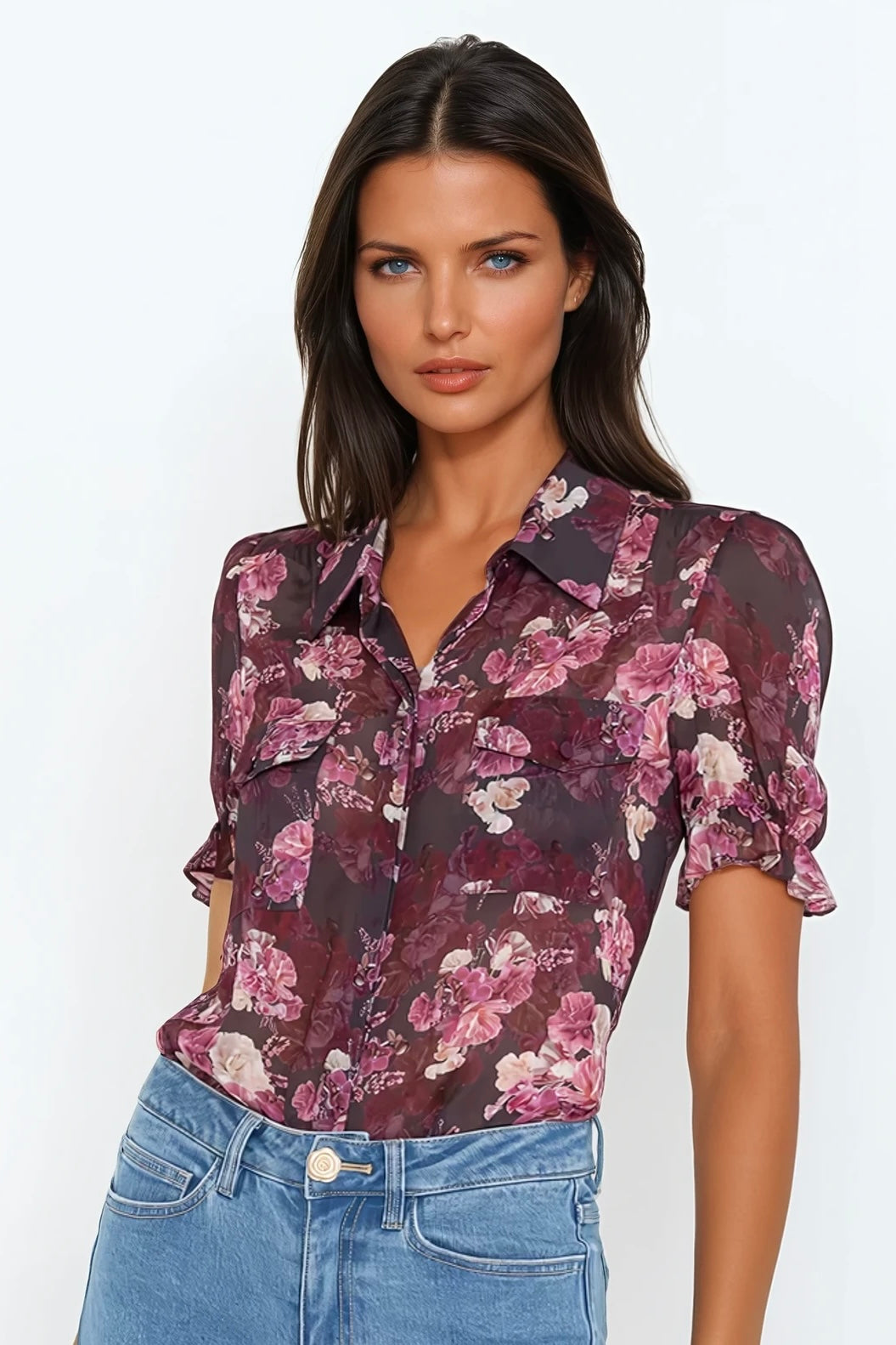 Crafted from luxe vegan silk georgette, this lightweight button-down features a striking floral print and feminine puff sleeves. Equally polished with denim or vegan leather, it's a versatile piece for day or evening.