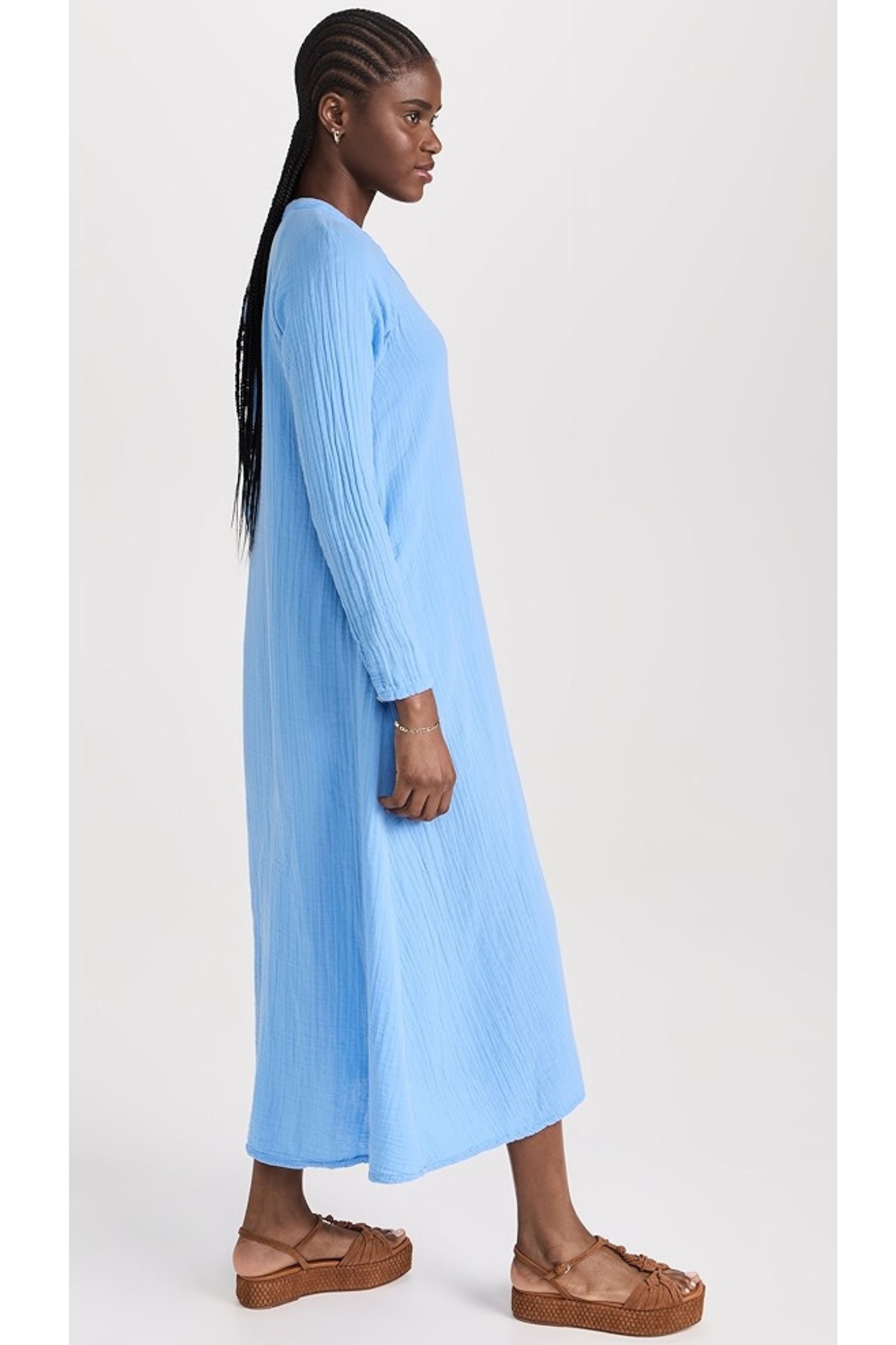 Designed with a relaxed fit and maxi length. Sleeves run short. Crinkled gauze fabric has a light hand and subtle puckering.