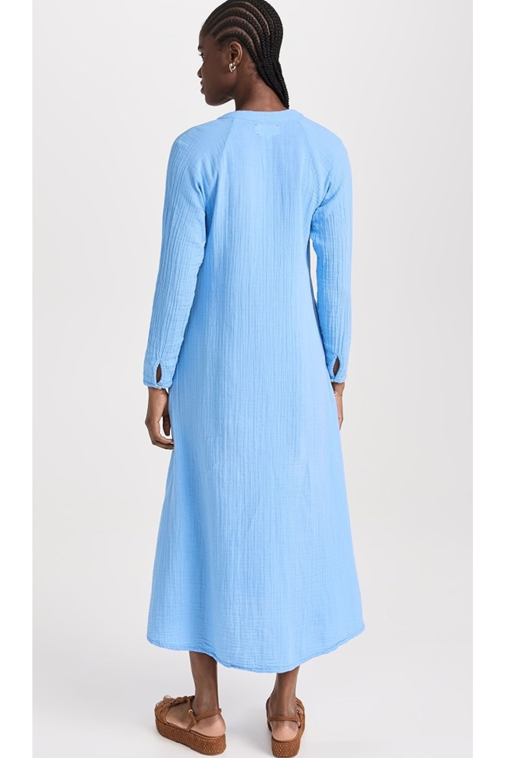 Easy on the Eyes. Tabitha is new this season from Xirena in a washed double faced cotton gauze for a soft, gently crinkled feel. This easy slipover midi dress has a band collar with rouleau button-front, raglan sleeves, and side seam pockets.