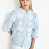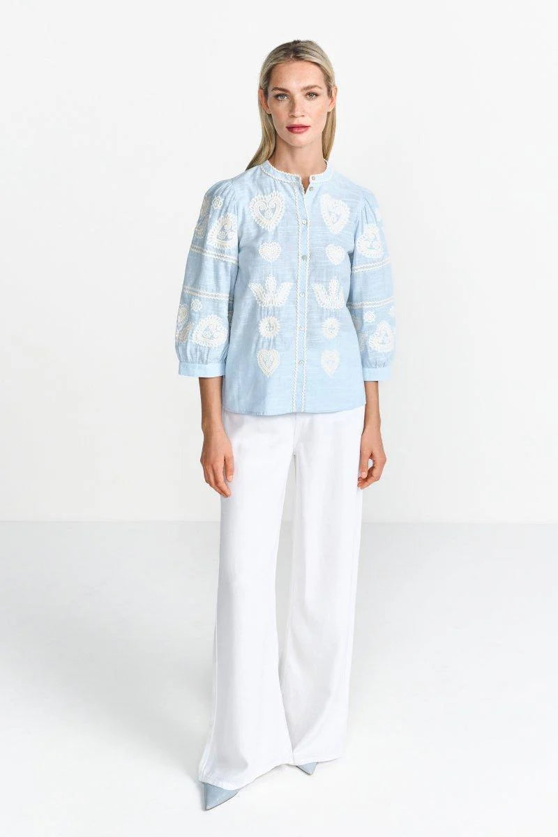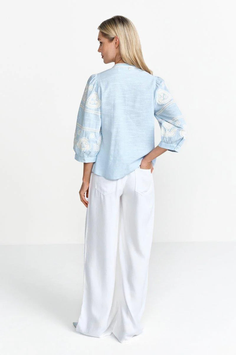 A touch of boho chic! This sky blue blouse with intricate embroidery and romantic balloon sleeves creates a feminine look. The stand-up collar and delicate details make it a playful eye-catcher for summer.
